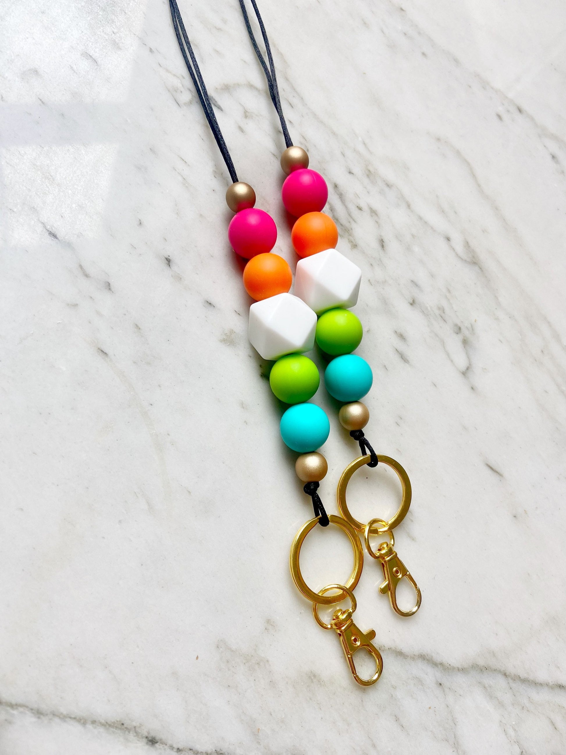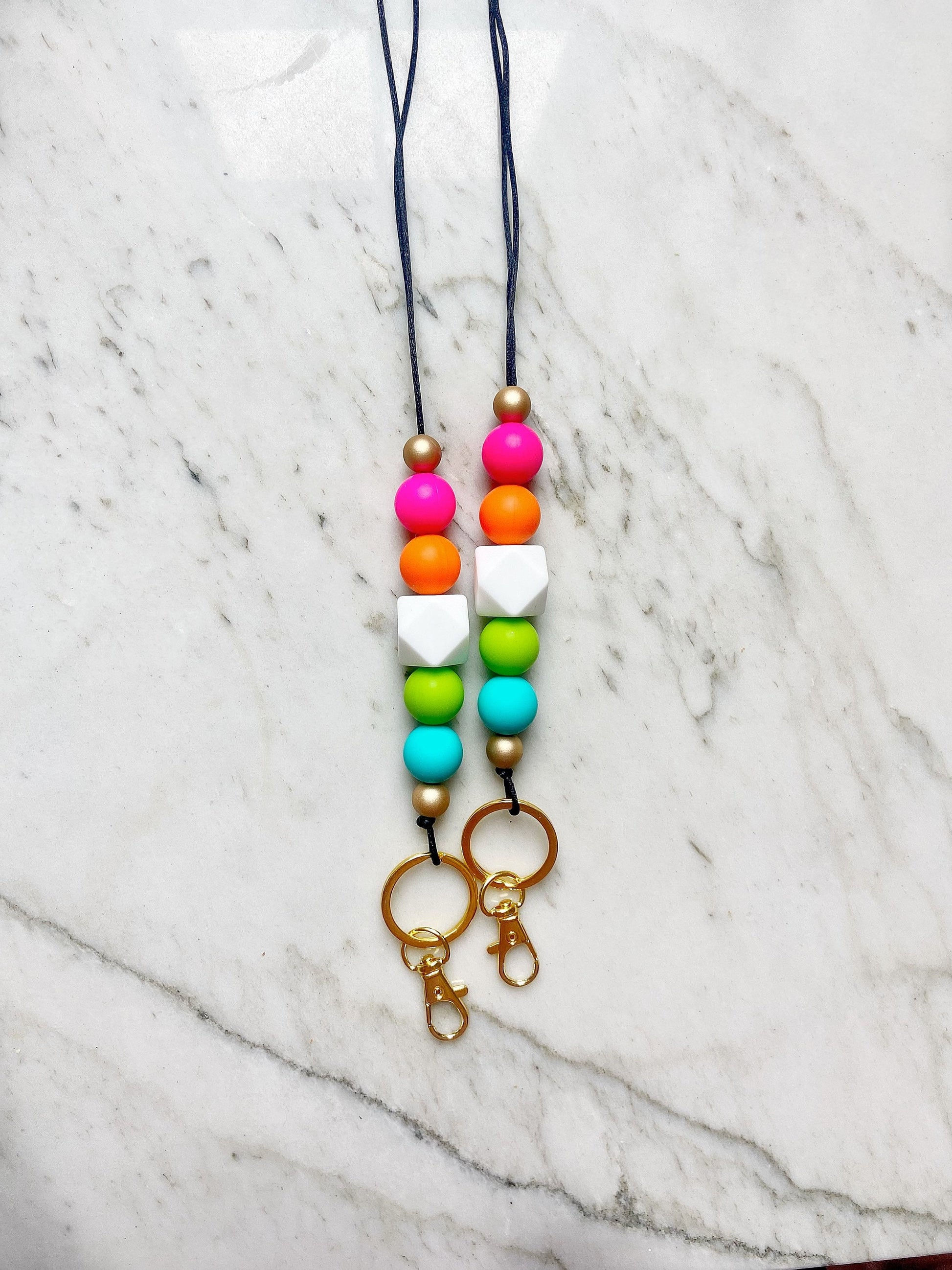 This lanyard is made with four 15 mm silicone beads, one 17mm silicone hexagon, a split ring, and a clasp. The lanyard makes it easy for you to attach your keys, school ID, or anything you need easily accessible throughout your day!