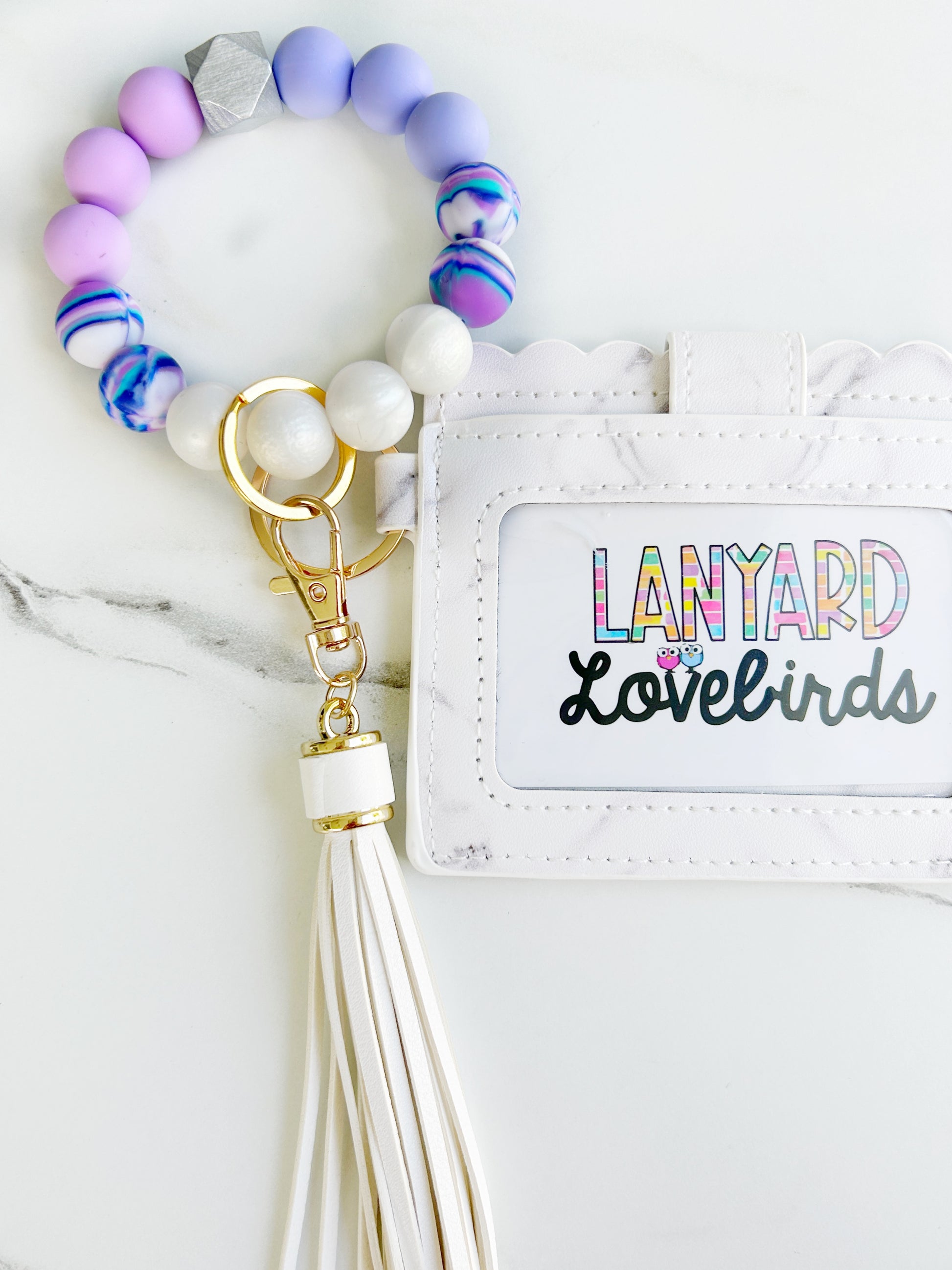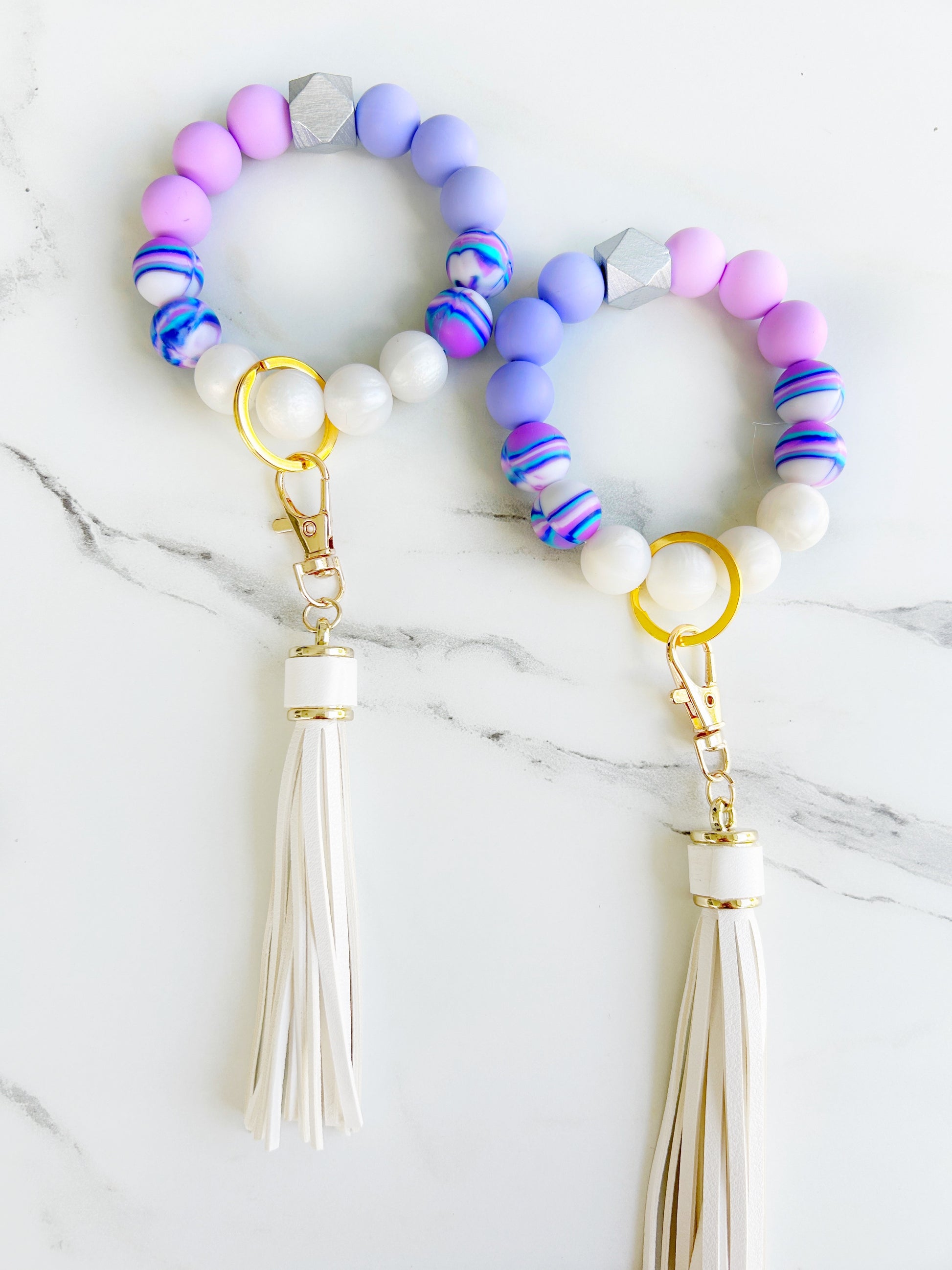 The wristband keychain is made with 15 mm silicone beads, split ring, clasp, and leather tassel. The O wristband keychain makes it easy for you to have your keys and wallet attached to your wristband, which easily slides onto your wrist!
