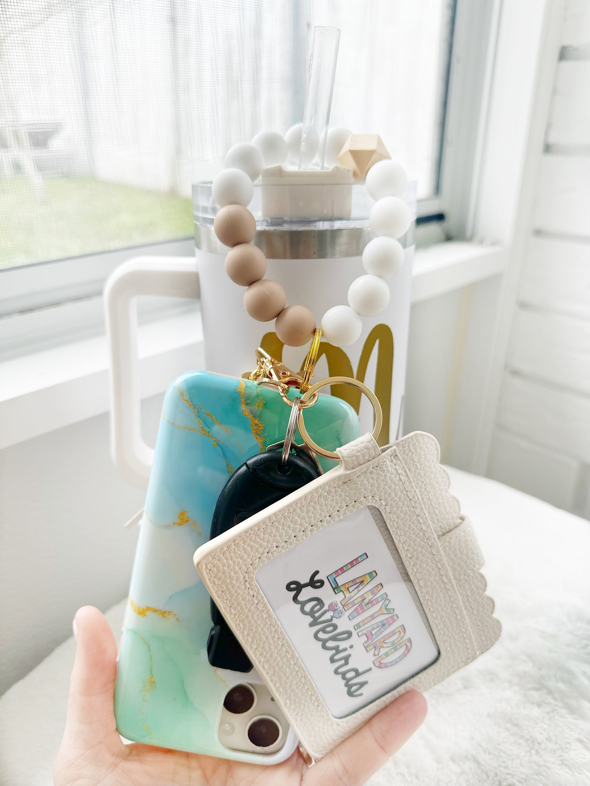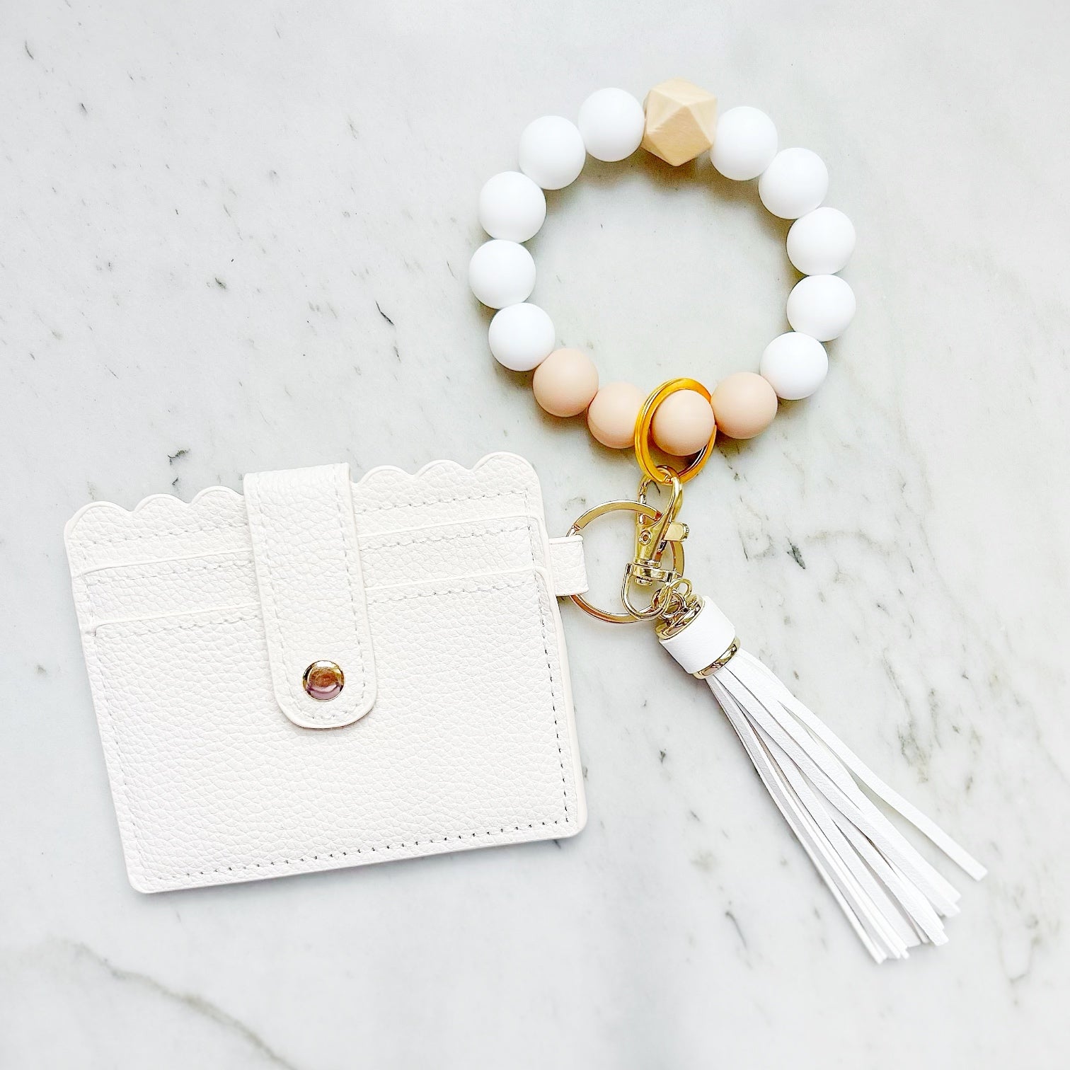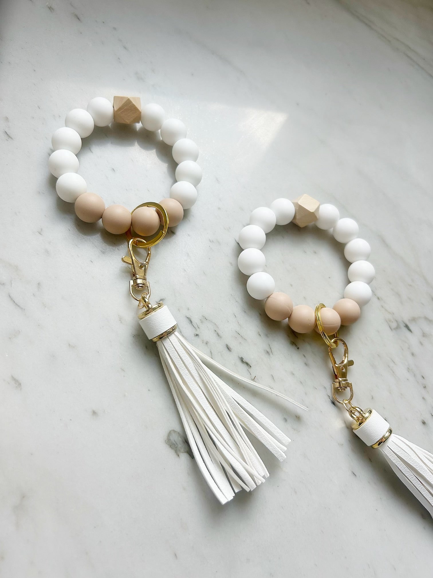 The wristband keychain is made with 15mm silicone beads, one wooden 15mm hexagon bead, split ring, clasp, and leather tassel. The wristband keychain makes it easy for you to have your keys and wallet attached to your wristband, which easily slides onto your wrist!
