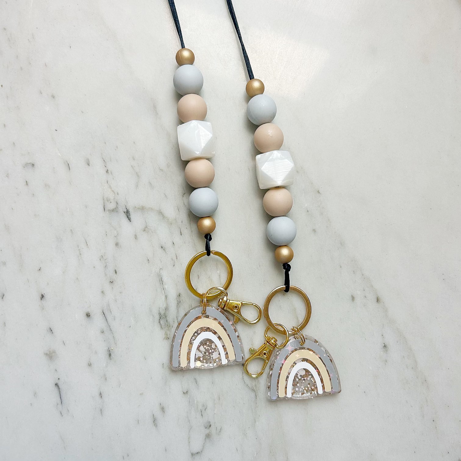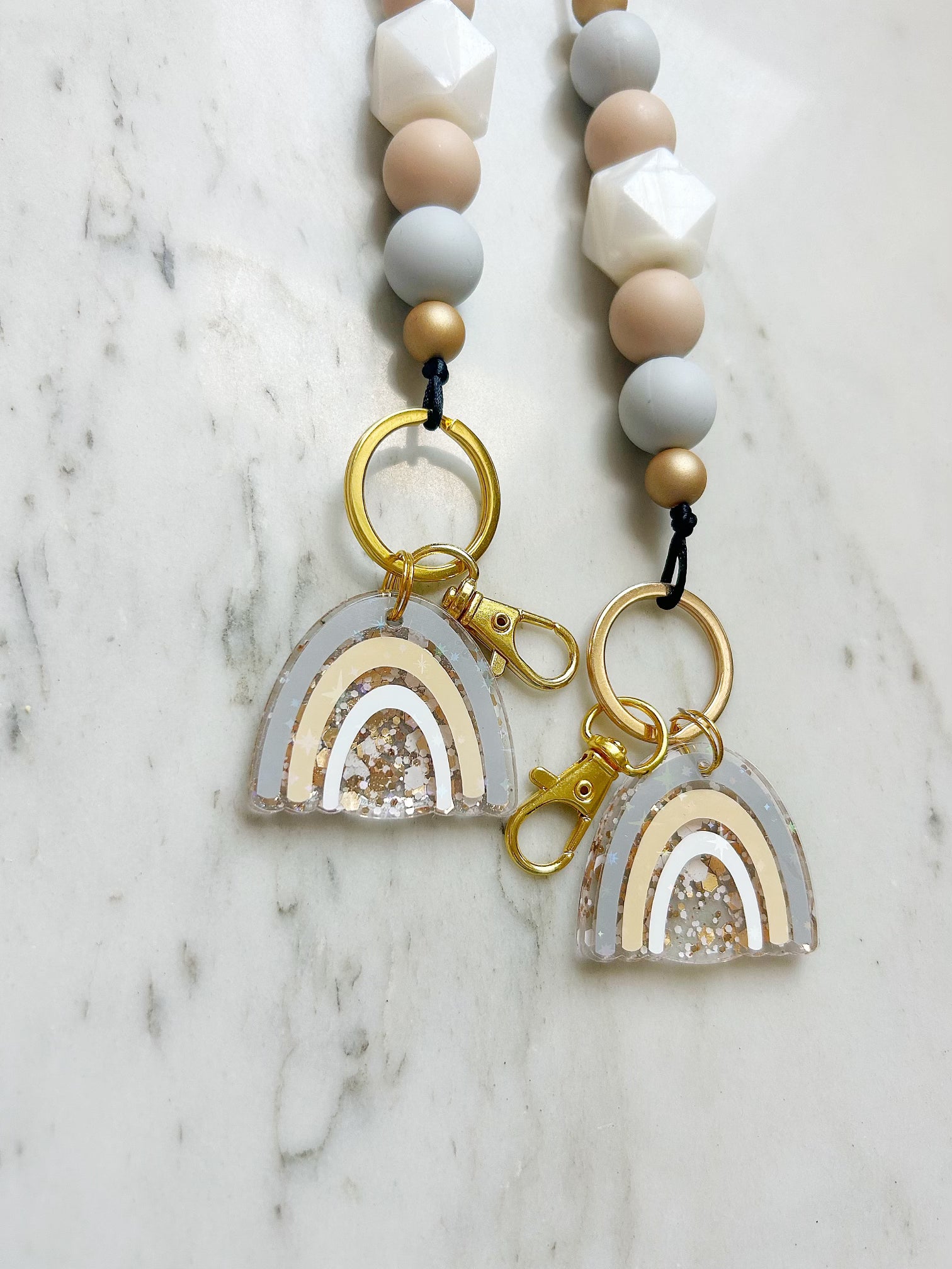 This lanyard+charm is made with four 15mm silicone round beads, one 17mm silicone hexagon bead, two 12 mm gold silicone beads, a split ring, and clasp. Attached is an acrylic glitter rainbow charm that’s about 1.5 inches long. The lanyard makes it easy for you to attach your keys, school ID, or anything you need easily accessible throughout your day!