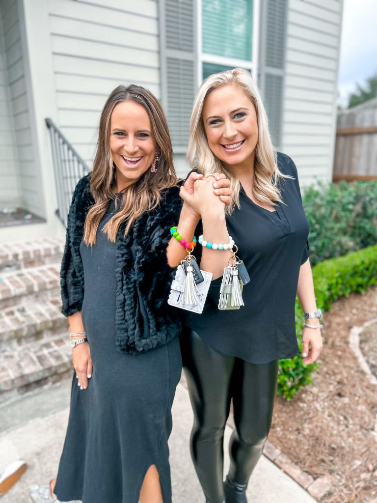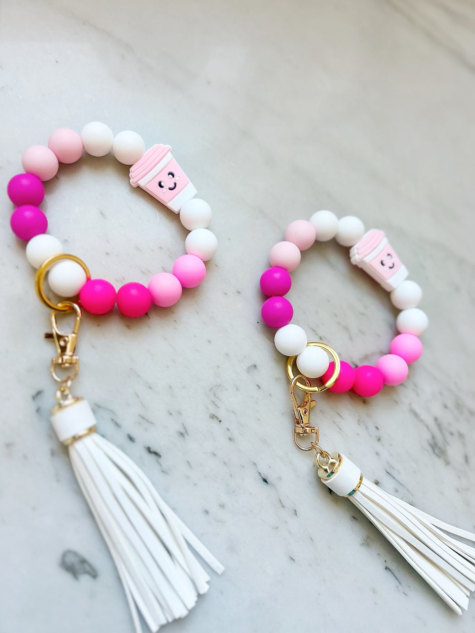 The wristband keychain is made with 15mm silicone beads, one coffee cup silicone bead, split ring, clasp, and leather tassel. The wristband keychain makes it easy for you to have your keys and wallet attached to your wristband, which easily slides onto your wrist!