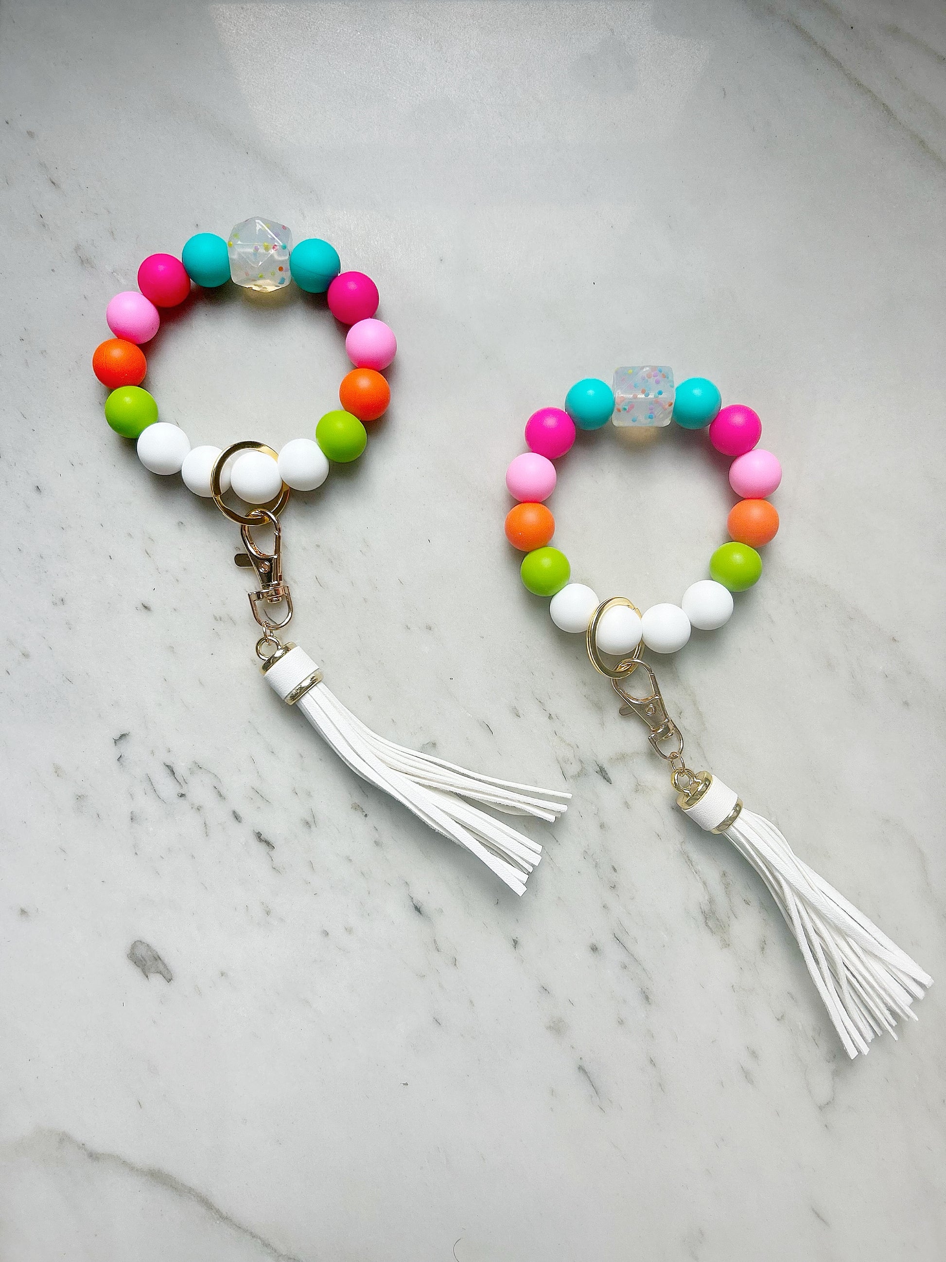The wristband keychain is made with 15 mm silicone beads, split ring, clasp, and leather tassel. The O wristband keychain makes it easy for you to have your keys and wallet attached to your wristband, which easily slides onto your wrist!