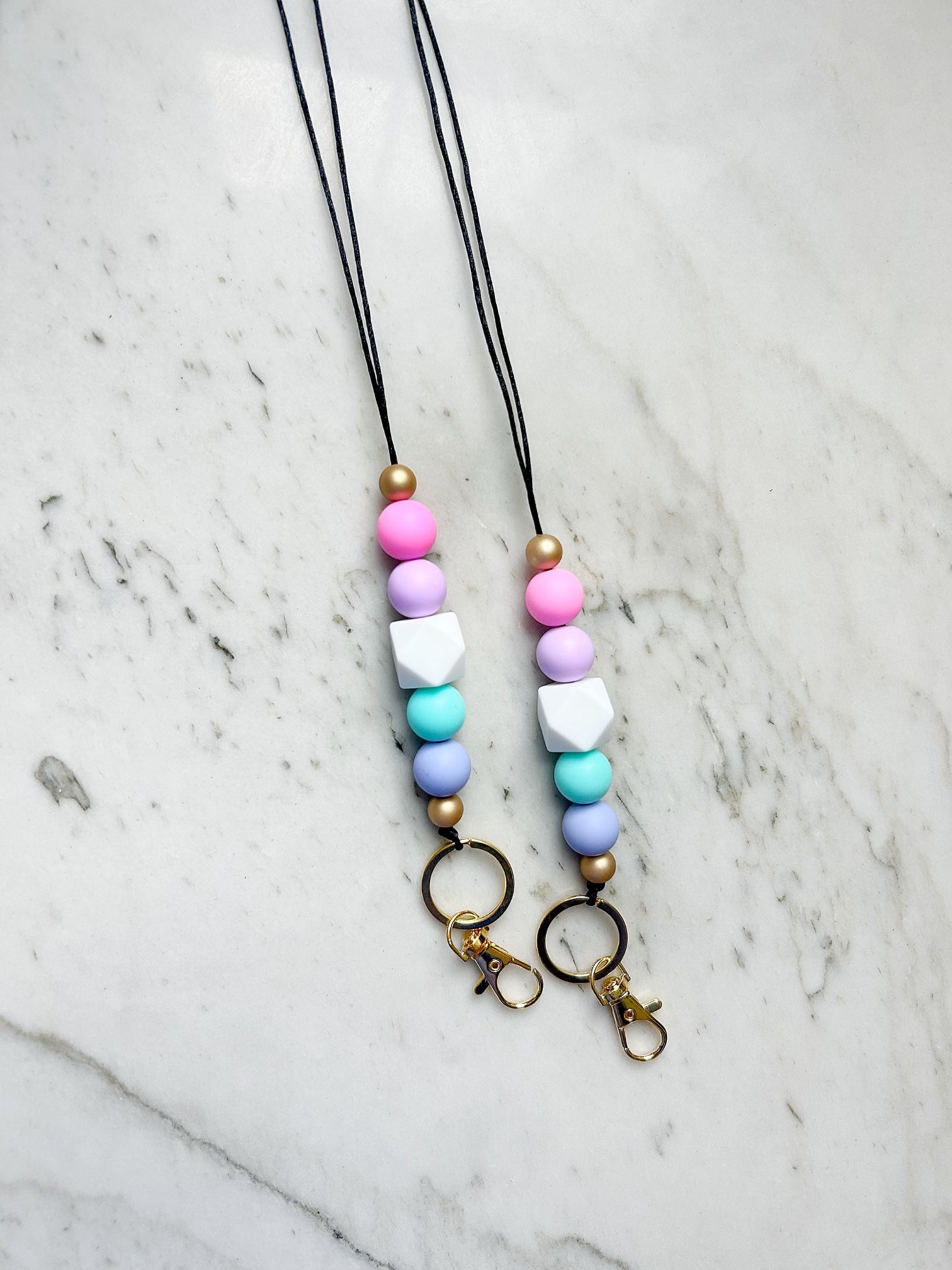 This lanyard is made with 5 silicone beads (four 15mm and one 17mm hexagon), two 12 mm gold silicone beads, a split ring, and clasp. The lanyard makes it easy for you to attach your keys, school ID, or anything you need easily accessible throughout your day!