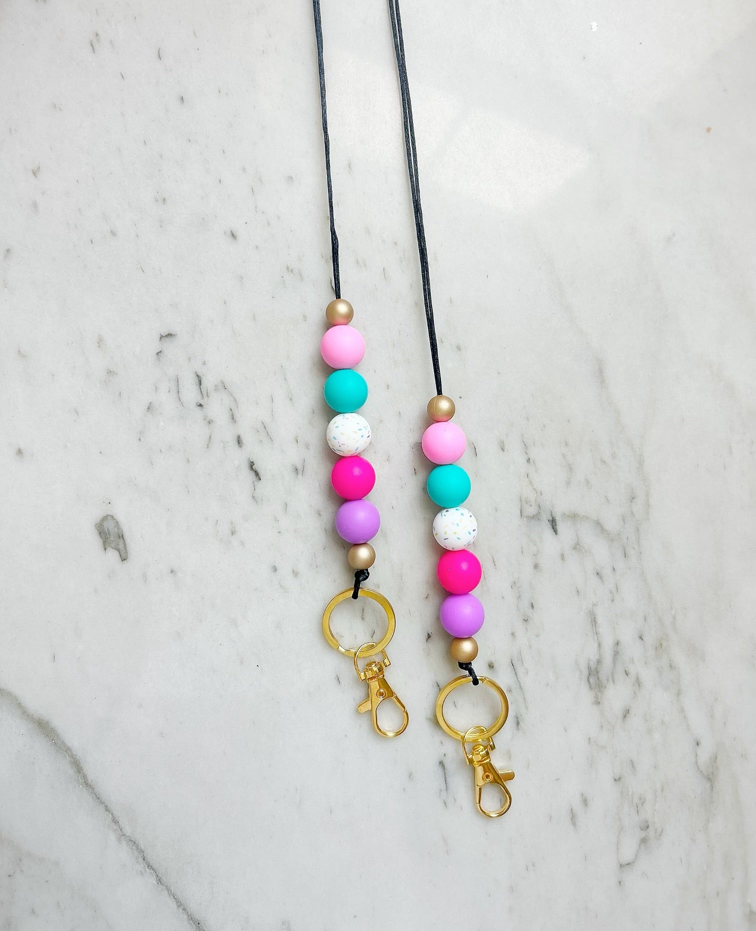 Lanyard is made with five 15 mm silicone beads, two 12 mm gold silicone beads, split ring, and clasp. The lanyard makes it easy for you to attach your keys, school ID, or anything you need easily accessible throughout your day!