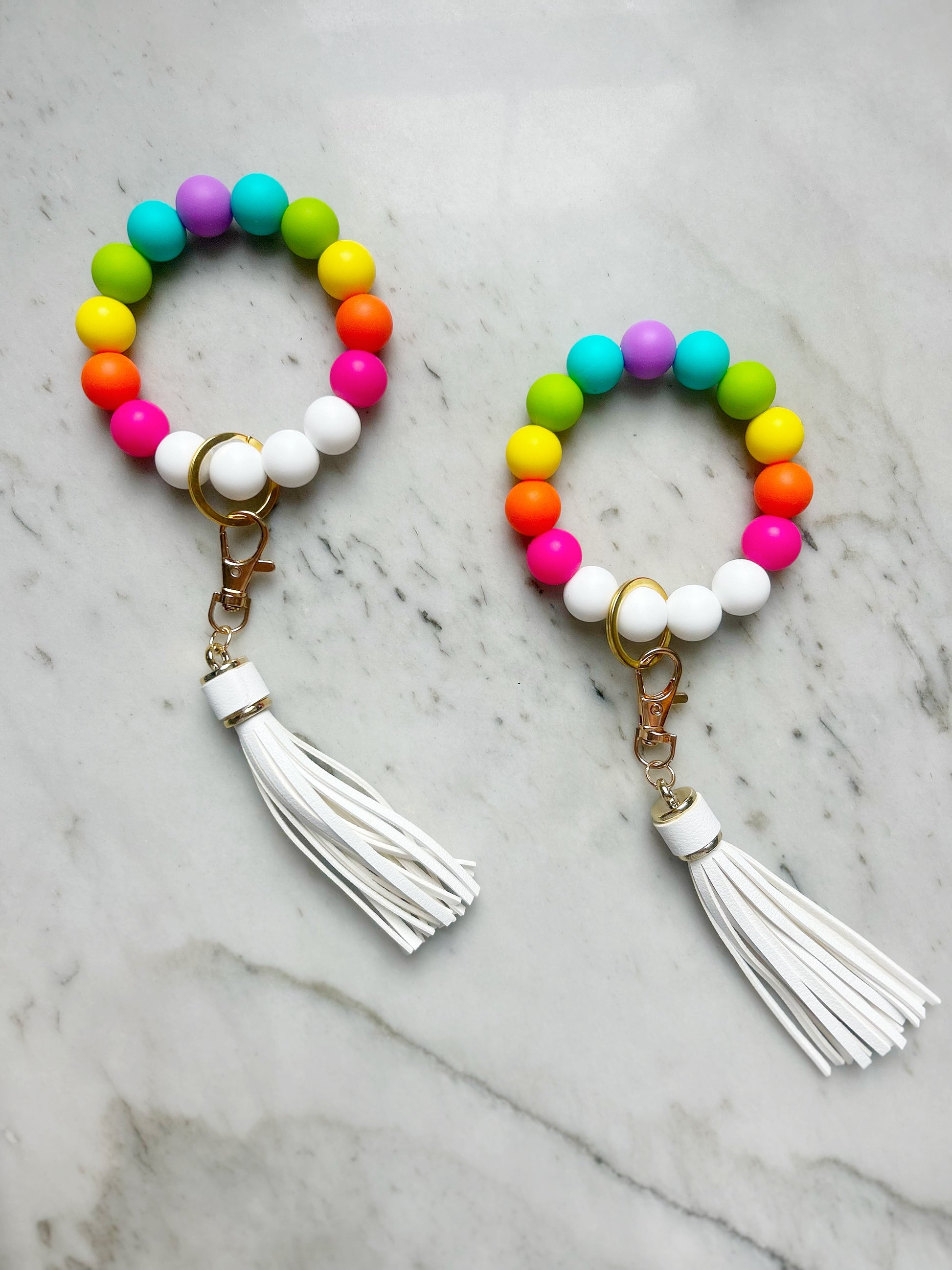The wristband keychain is made with 15mm silicone beads, split ring, clasp, and leather tassel. The wristband keychain makes it easy for you to have your keys and wallet attached to your wristband, which easily slides onto your wrist! Wristband is made with elastic, so it will not fall off of your wrist!