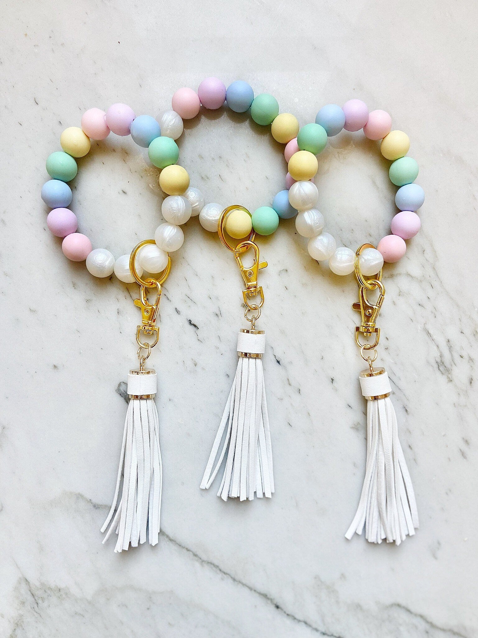 The wristband keychain is made with 15 mm silicone beads, split ring, clasp, and leather tassel. The wristband keychain makes it easy for you to have your keys and wallet attached to your wristband, which easily slides onto your wrist!