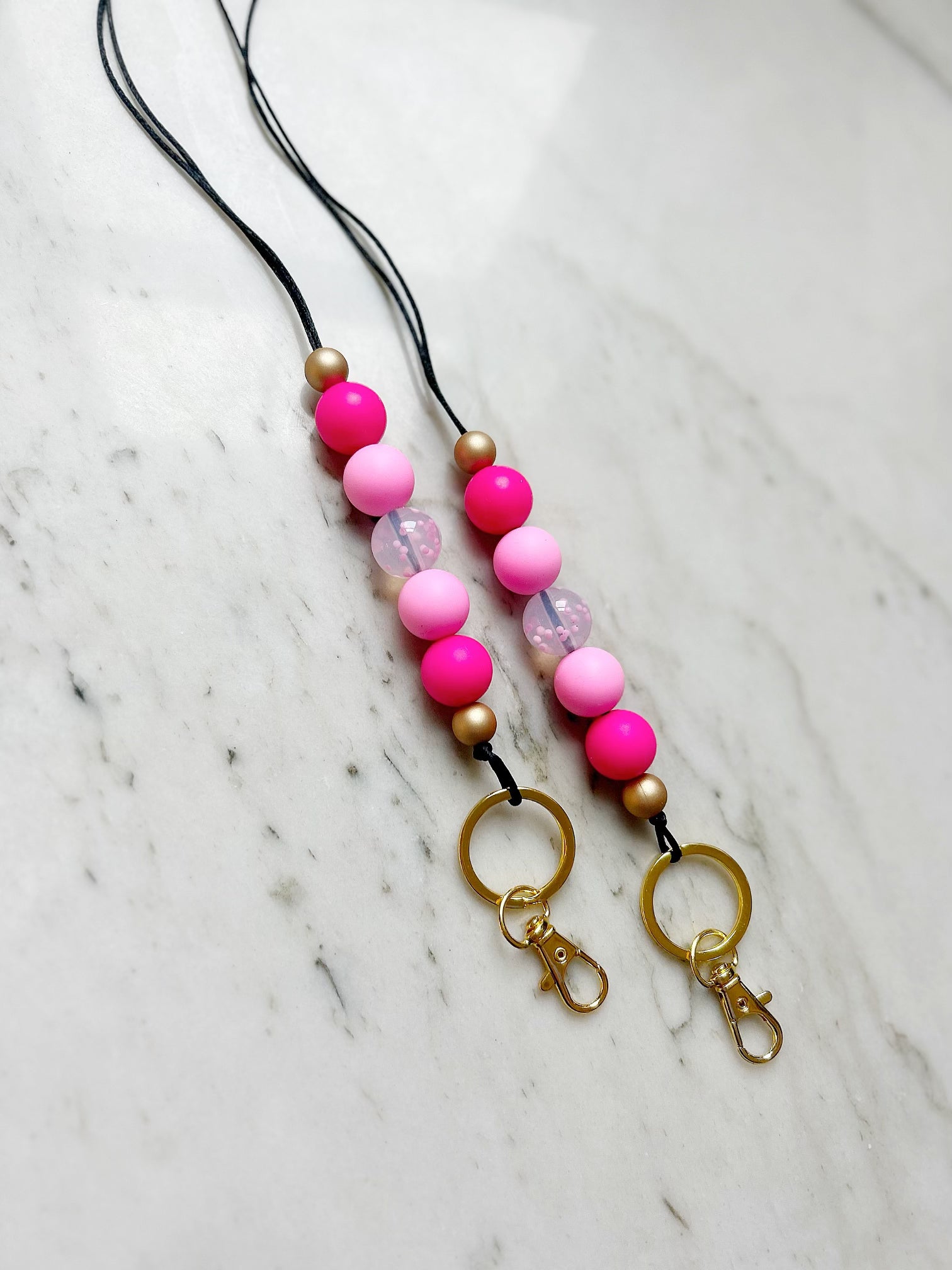 Lanyard is made with 5 15 mm silicone beads, two 12 mm gold silicone beads, split ring, and clasp. The lanyard makes it easy for you to attach your keys, school ID, or anything you need easily accessible throughout your day!