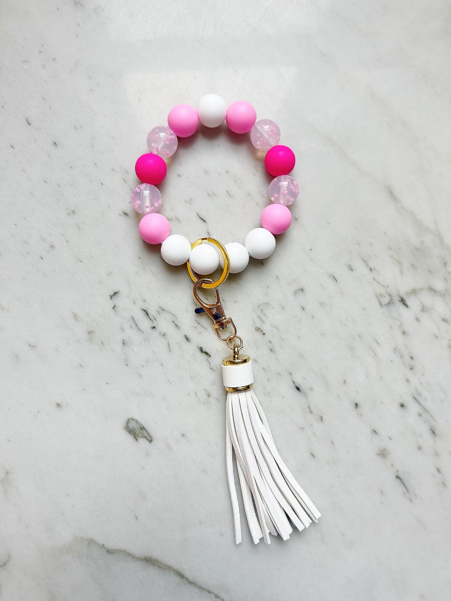 The wristband keychain is made with 15 mm silicone beads, split ring, clasp, and leather tassel. The wristband keychain makes it easy for you to have your keys and wallet attached to your wristband, which easily slides onto your wrist!