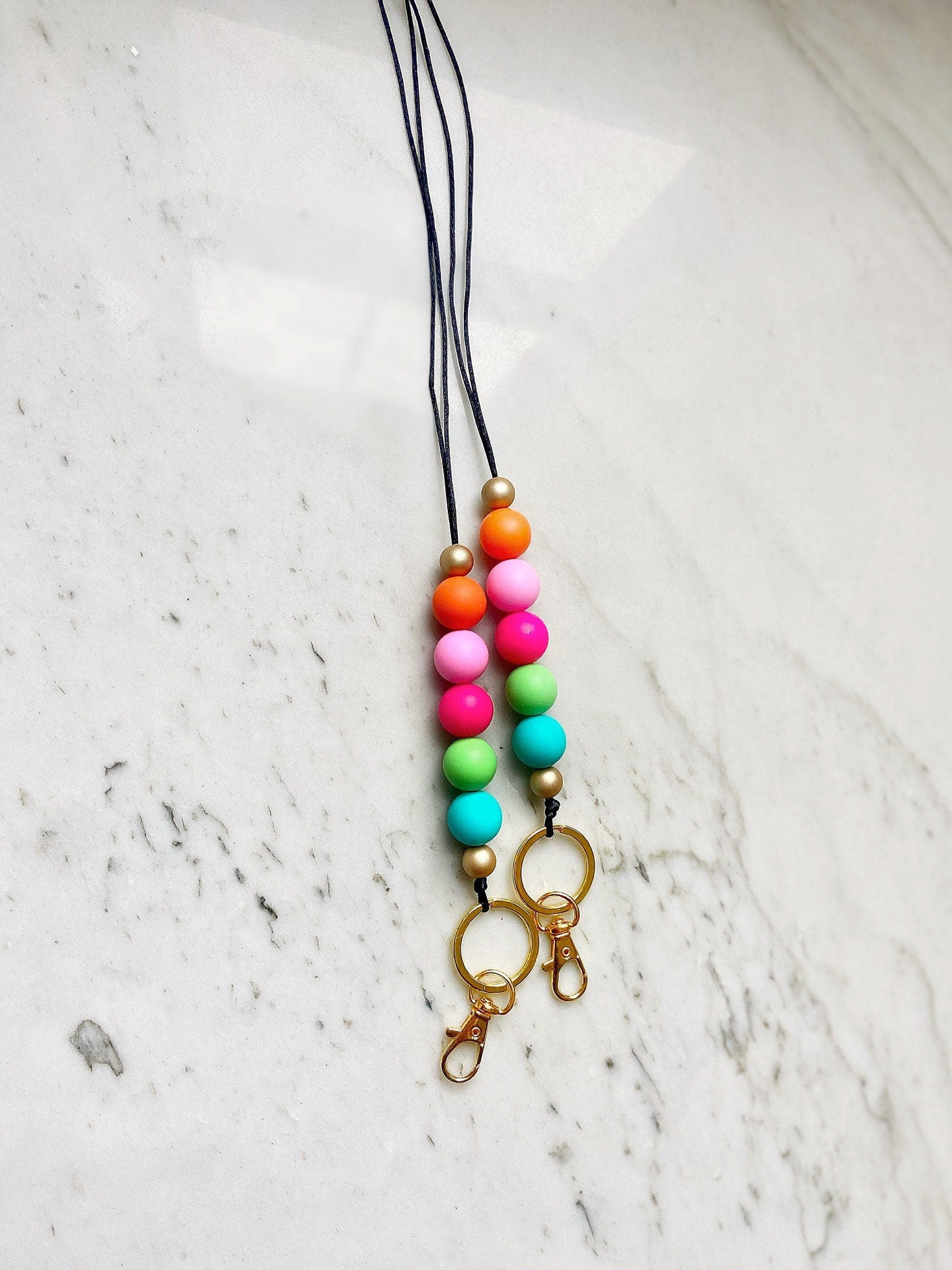 Lanyard is made with 5 15 mm silicone beads, two 12 mm gold silicone beads, split ring, and clasp. The lanyard makes it easy for you to attach your keys, school ID, or anything you need easily accessible throughout your day!
