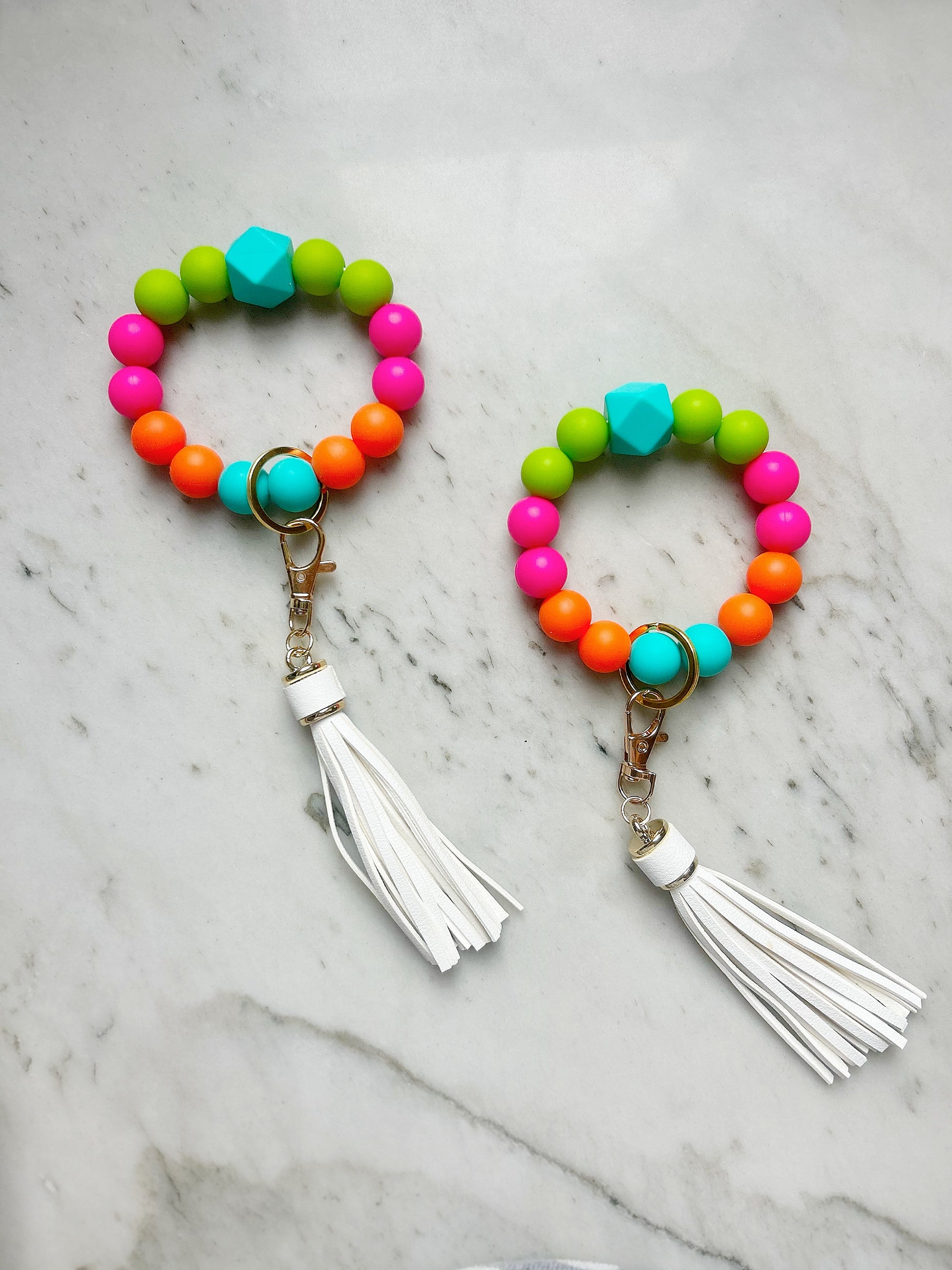 The wristband keychain is made with 15 mm silicone beads, split ring, clasp, and leather tassel. The wristband keychain makes it easy for you to have your keys and wallet attached to your wristband, which easily slides onto your wrist!