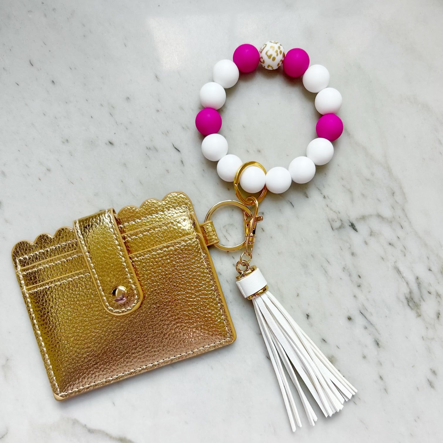The wristband keychain is made with 15 mm silicone beads, split ring, clasp, and leather tassel. The wristband keychain makes it easy for you to have your keys and wallet attached to your wristband, which easily slides onto your wrist!