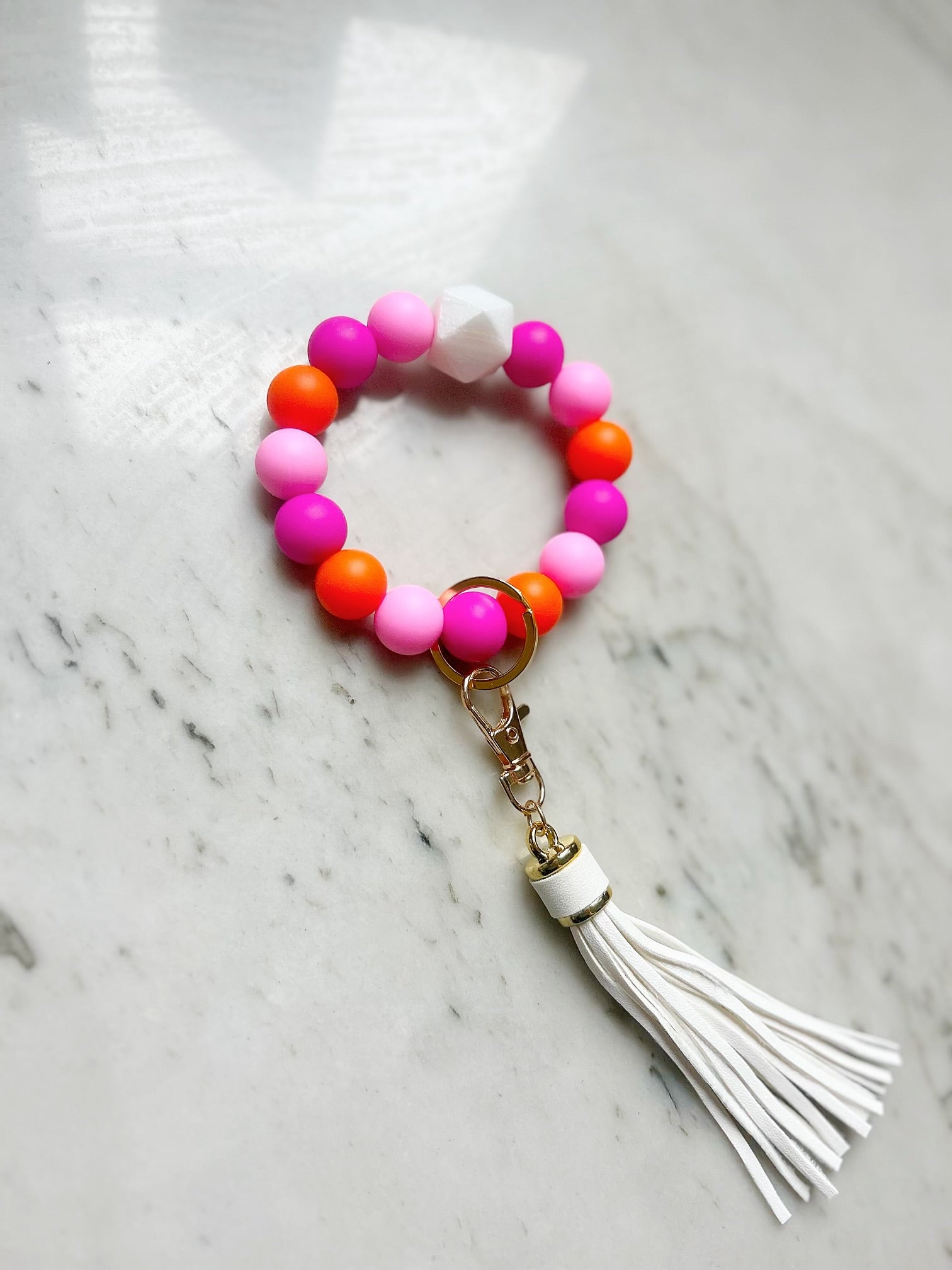 The wristband keychain is made with 15 mm silicone beads, split ring, clasp, and leather tassel. The O wristband keychain makes it easy for you to have your keys and wallet attached to your wristband, which easily slides onto your wrist!