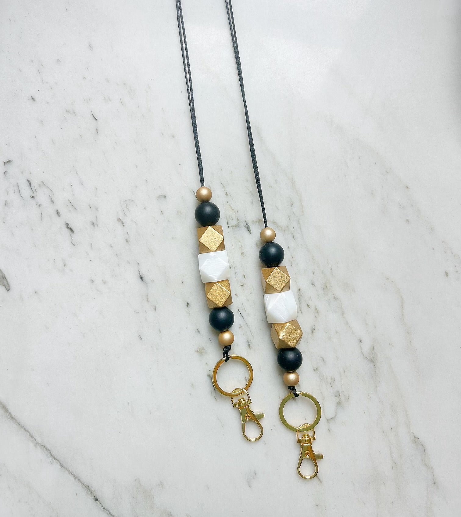 Lanyard is made with silicone beads, wooden beads, split ring, and clasp. The lanyard makes it easy for you to attach your keys, school ID, or anything you need easily accessible throughout your day!