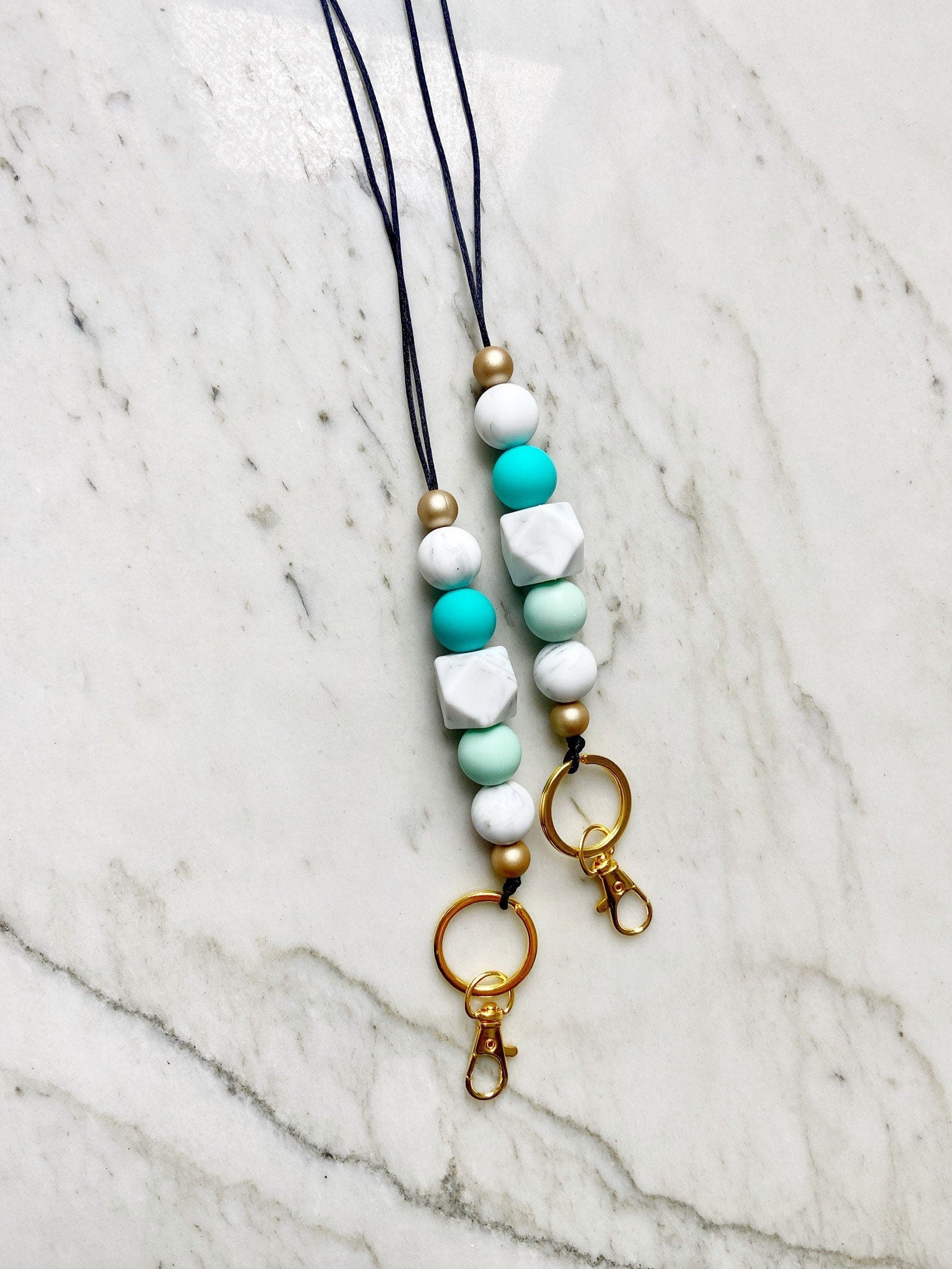 Lanyard is made with 5 15 mm silicone beads, two 12 mm gold silicone beads, split ring, and clasp. The lanyard makes it easy for you to attach your keys, school ID, or anything you need easily accessible throughout your day!