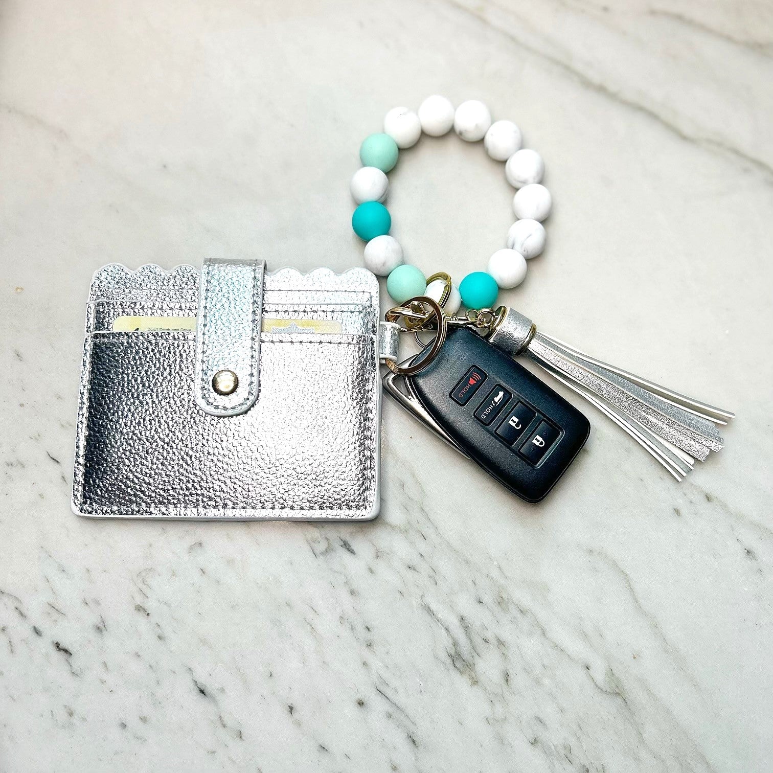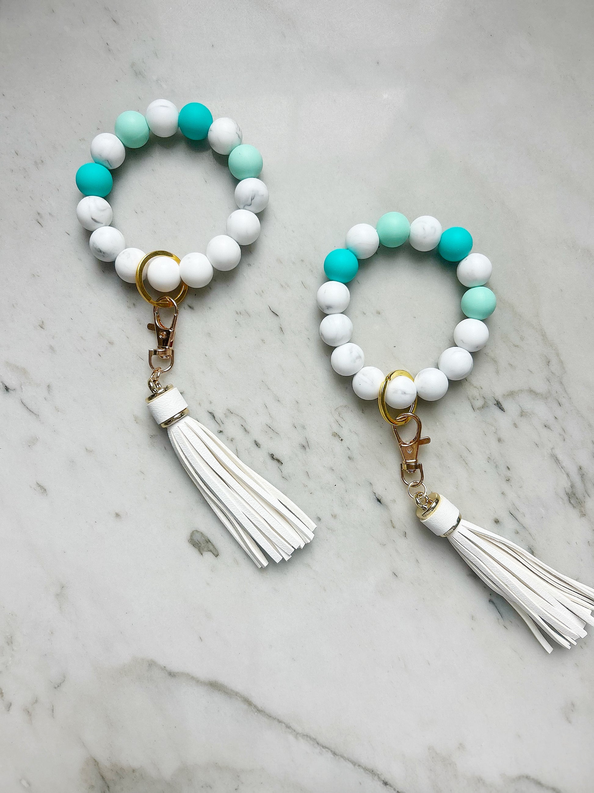 The wristband keychain is made with 15 mm silicone beads, split ring, clasp, and leather tassel. The wristband keychain makes it easy for you to have your keys and wallet attached to your wristband, which easily slides onto your wrist!